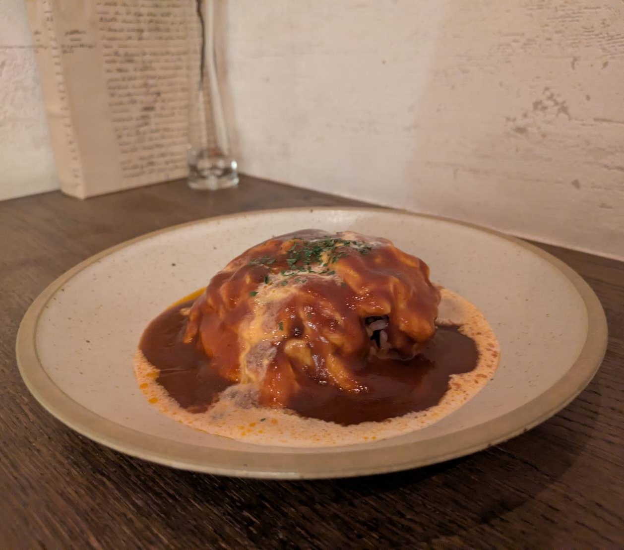 濃厚なソースとなめらかなチーズのミックスです。雑穀米を使用しています。サラダとスープが付きます。
